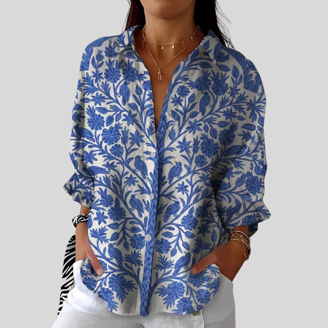 Frederikke | Blue Garden Blouse brings timeless beauty to your wardrobe with its detailed floral and bird motif in striking blue tones against a soft cream base. Elegant yet versatile, it’s perfect for both casual and semi-formal occasions, offering a chic look that never goes out of style.